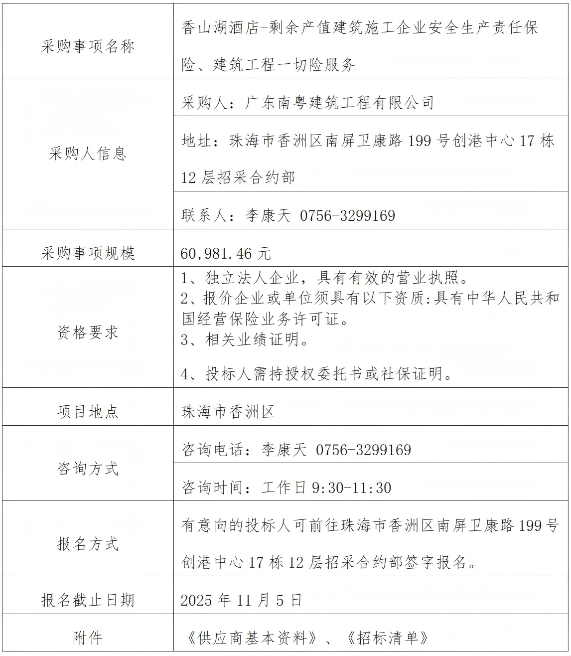 香山湖酒店-剩余产值建筑施工企业安全生产责任保险、建筑工程一切险服务 专栏:工程招标 发布日期: 2025-10-31 作者:招采管理中心 附件:供应商基本资料表 附件:香山迎宾馆(现已变更为香山湖酒店)项目施工总承包延期-工程一切险及安责险保险服务招标清单 返回列表 上一篇:没有了 下一篇:广昌保障房配套基础设施项目施工总承包工程一切险、建筑施工企业安全生产责任保险(第二次)