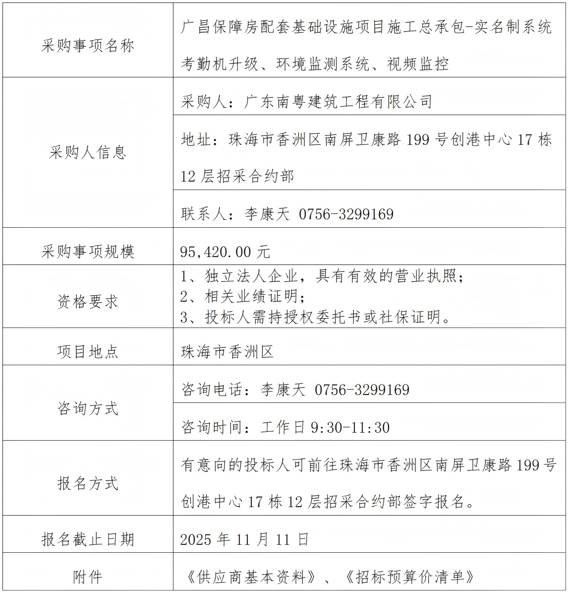 广昌保障房配套基础设施项目施工总承包-实名制系统考勤机升级、环境监测系统、视频监控 专栏:工程招标 发布日期: 2025-11-07 作者:招采管理中心 附件:供应商基本资料表 附件:广昌保障房配套基础设施项目施工总承包-智慧工地系统采购招标清单 - 空白清单 返回列表 上一篇:广昌保障房配套基础设施项目施工总承包-云端监控设备及技术服务 下一篇:广昌保障房配套基础设施项目施工总承包-混凝土材料采购