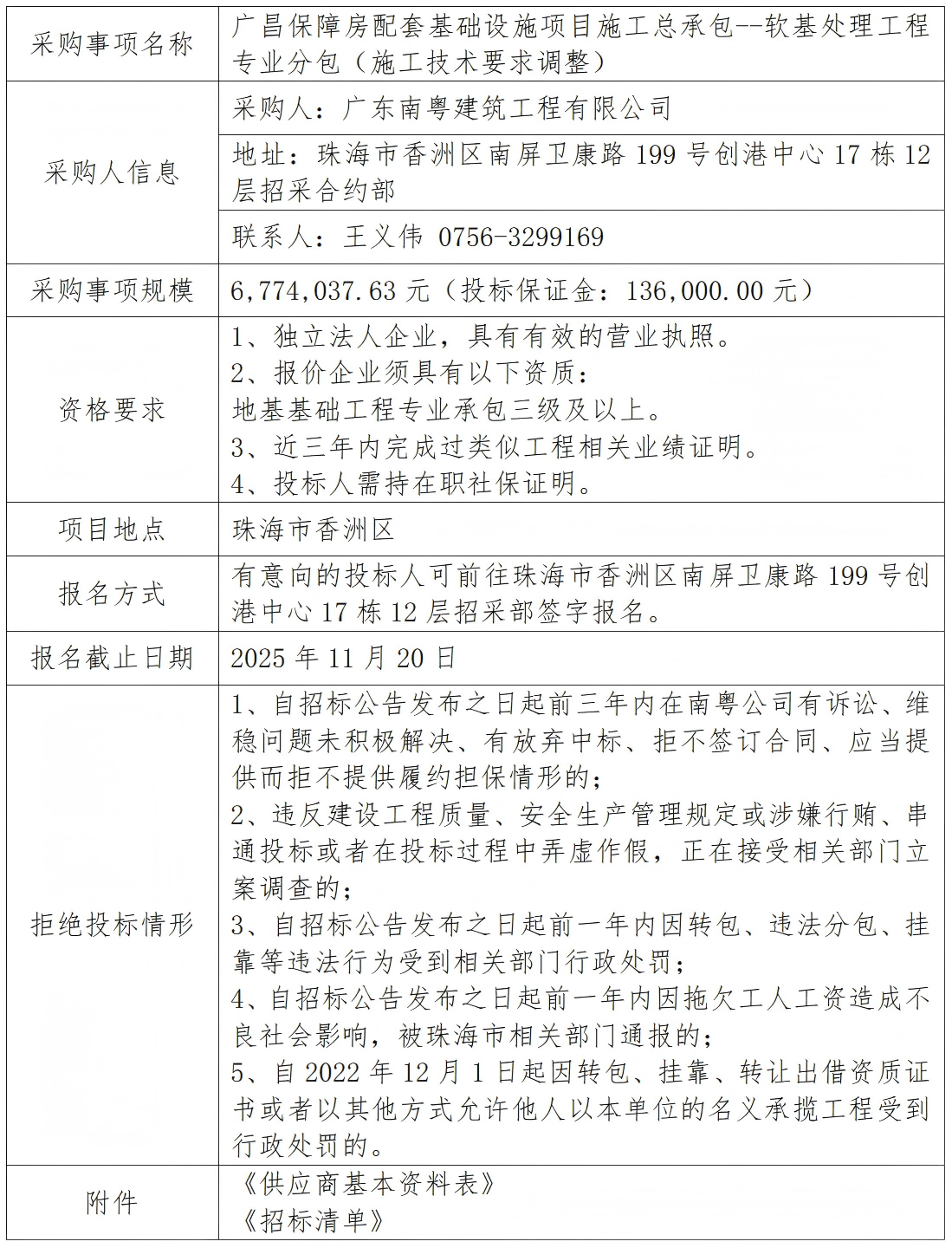 广昌保障房配套基础设施项目施工总承包--软基处理工程专业分包(施工技术要求调整) 专栏:工程招标 发布日期: 2025-11-18 作者:招采管理中心 附件:供应商基本资料表 附件:广昌保障房配套基础设施项目施工总承包--软基处理工程专业分包招标清单 返回列表 上一篇:广昌保障房配套基础设施项目施工总承包-钢板桩支护工程专业分包 下一篇:洪湾旧村更新项目周边环山路等市政道路工程-波形护栏材料采购