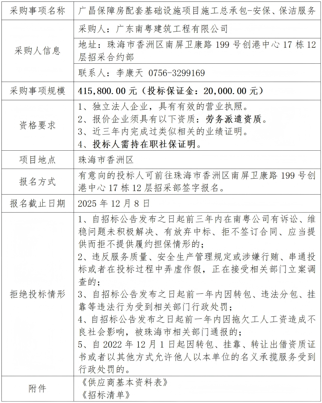 广昌保障房配套基础设施项目施工总承包-安保、保洁服务 专栏:工程招标 发布日期: 2025-12-02 作者:招采管理中心 附件:供应商基本资料表 附件:广昌保障房配套基础设施项目施工总承包-安保、保洁服务- 空白清单 返回列表 上一篇:广昌保障房配套基础设施项目施工总承包--土建劳务分包(均昌路+广湾街) 下一篇:广昌保障房配套基础设施项目施工总承包-食堂服务