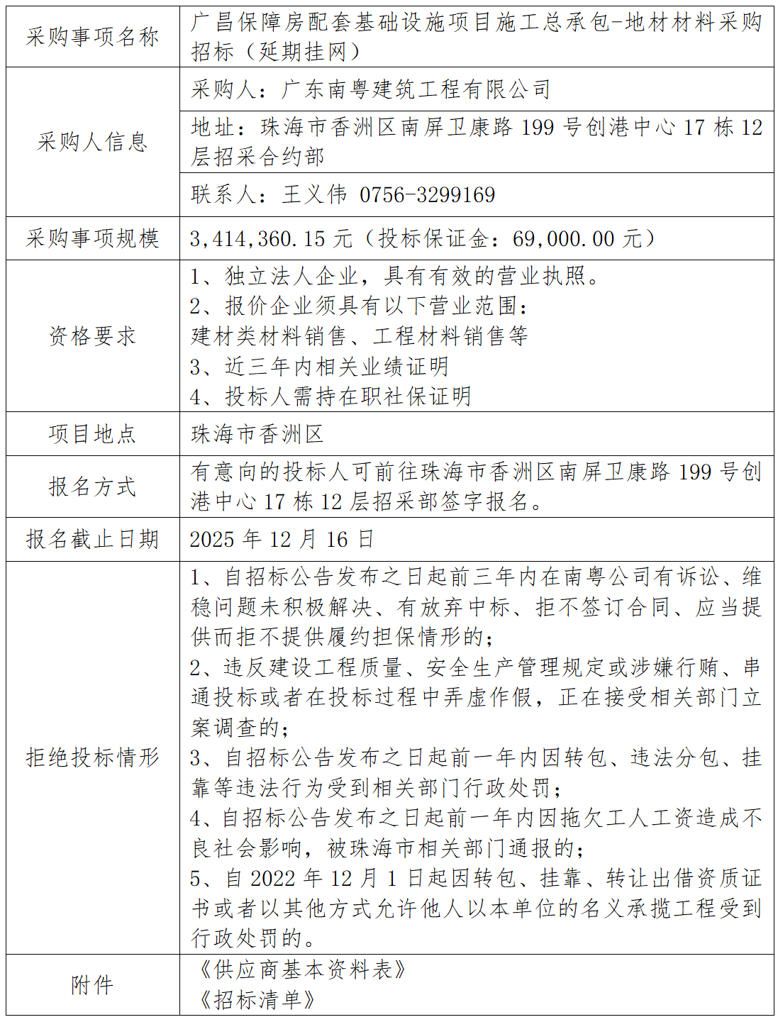 广昌保障房配套基础设施项目施工总承包-地材材料采购招标(延期挂网) 专栏:工程招标 发布日期: 2025-12-11 作者:招采管理中心 附件:供应商基本资料表 附件:广昌保障房配套基础设施项目施工总承包-地材材料采购招标清单 返回列表 上一篇:广昌保障房配套基础设施项目施工总承包-混凝土材料采购(预算、税率变更) 下一篇:广昌保障房配套基础设施项目施工总承包-钢管租赁服务