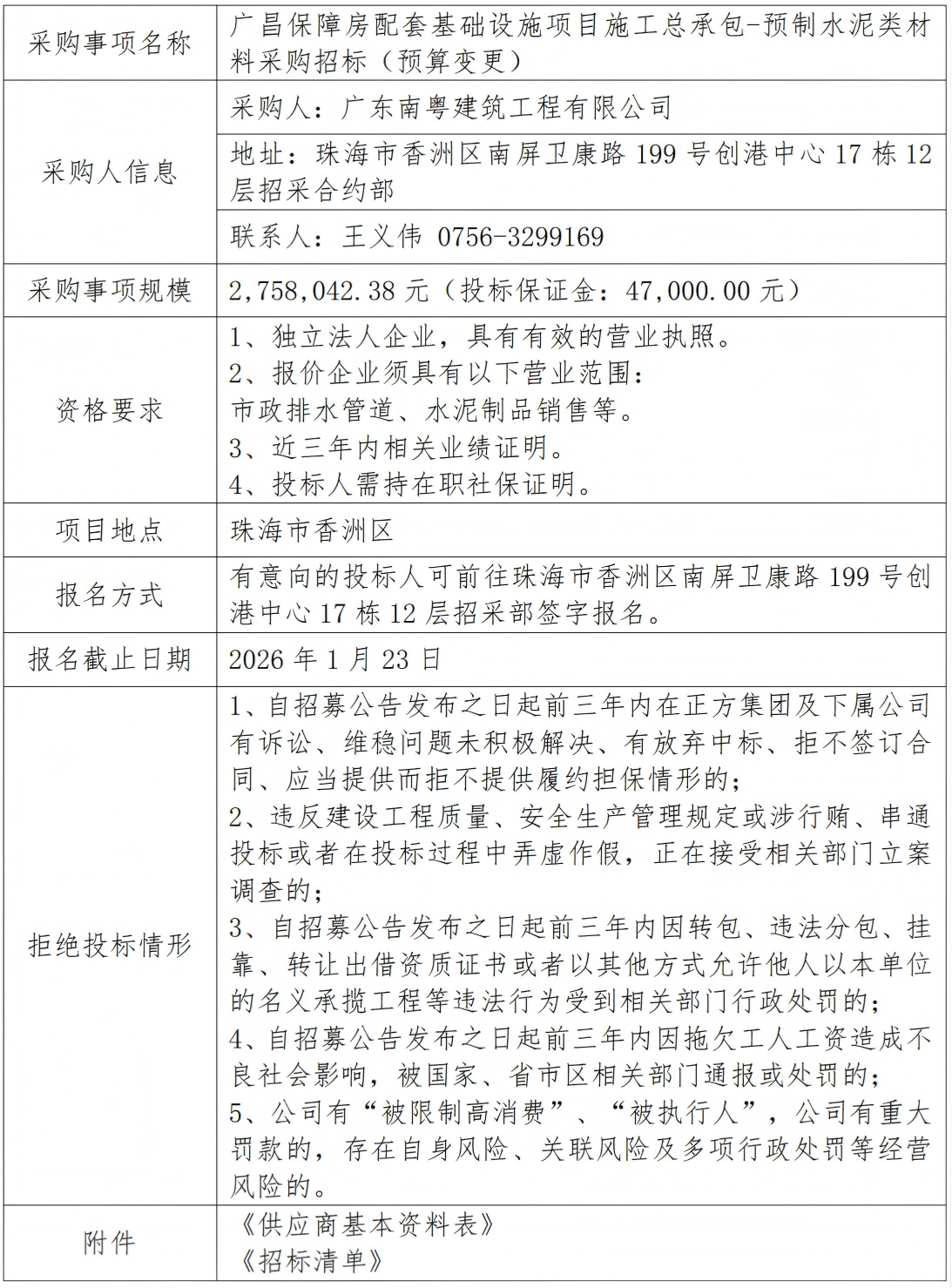 广昌保障房配套基础设施项目施工总承包-预制水泥类材料采购招标(预算变更) 专栏:工程招标 发布日期: 2026-01-20 作者:招采管理中心 附件:供应商基本资料表 附件:广昌保障房配套基础设施项目施工总承包-预制水泥类材料采购招标清单 返回列表 上一篇:广昌保障房配套基础设施项目施工总承包-排管及配件类材料采购 下一篇:广昌保障房配套基础设施项目施工总承包-模板材料采购(延期公示)