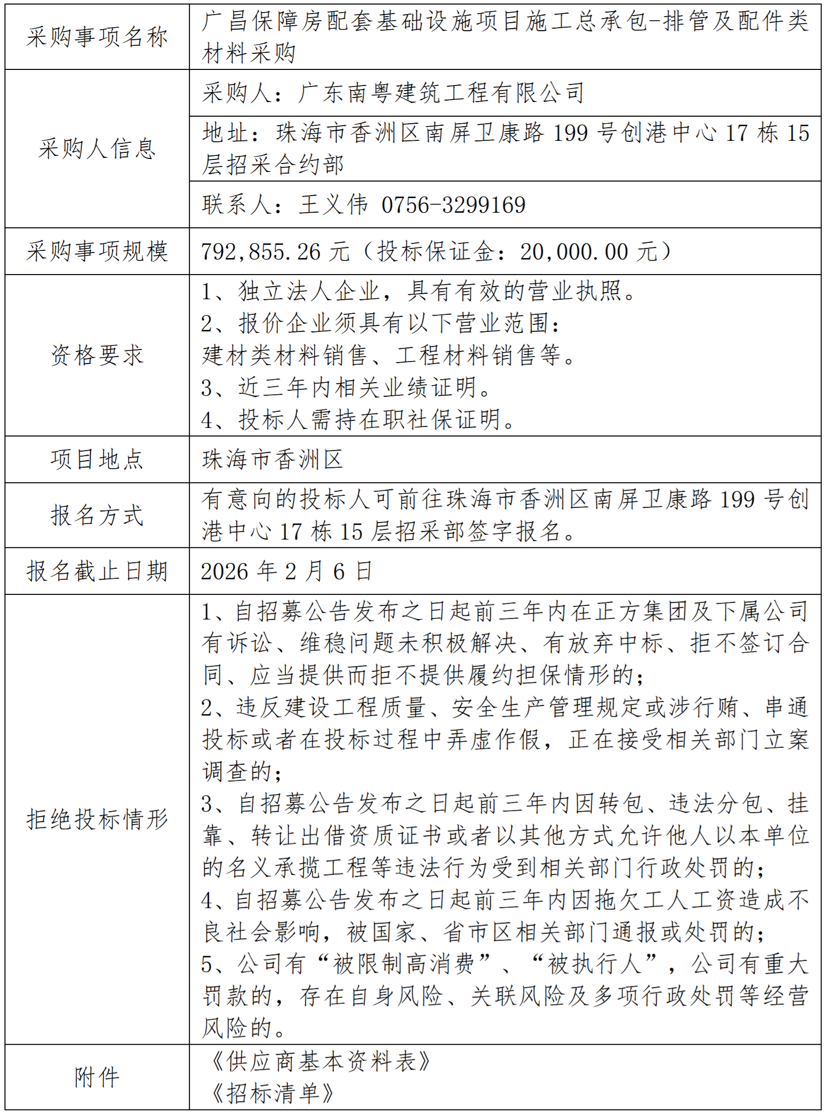 广昌保障房配套基础设施项目施工总承包-排管及配件类材料采购 专栏:工程招标 发布日期: 2026-02-04 作者:招采管理中心 附件:供应商基本资料表 附件:广昌保障房配套基础设施项目施工总承包-排管及配件类材料采购招标清单 返回列表 上一篇:珠海市香洲区中小学、幼儿园办学场所及停车场改造提升工程项目施工总承包-广昌小学临建工程专业分包 下一篇:广昌保障房配套基础设施项目施工总承包-预制水泥类材料采购招标(预算变更)