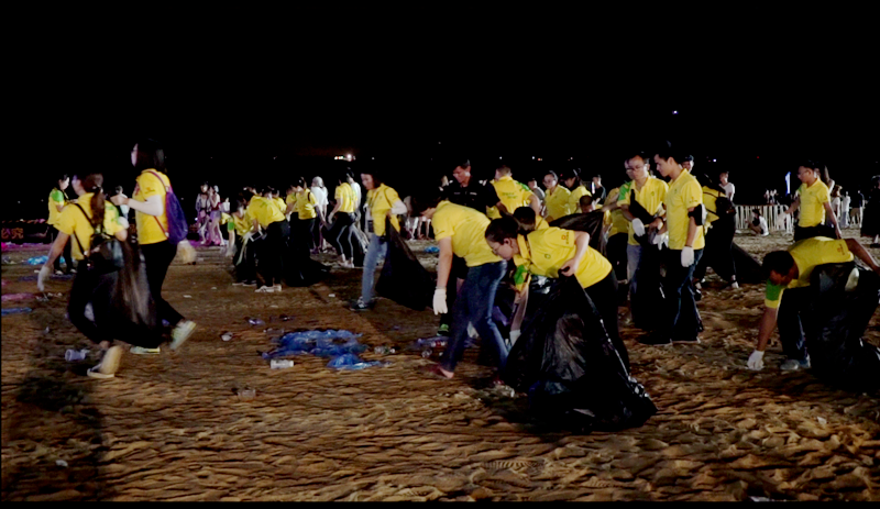 在音符停止跳跃之前,”小黄人”早已在舞台前集结待命,在人群散去之后马上进行拉网式沙滩清洁工作。游客们离场,带走的只有美好的回忆,留下的只有脚印。
