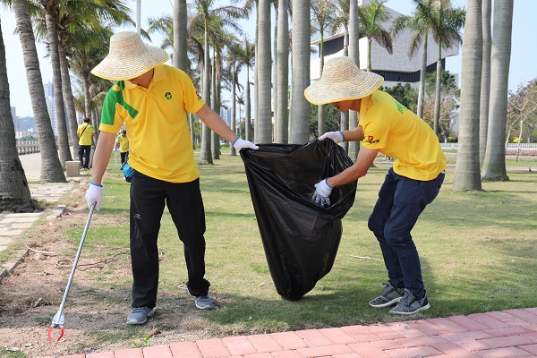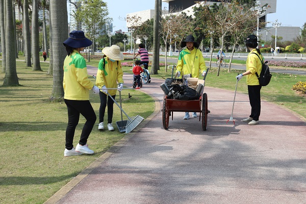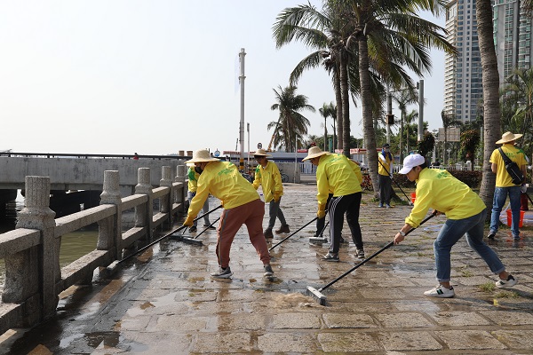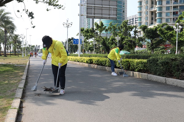 当天上午8点40分,各支援人员已在海峡社区公园小广场前集合完毕。讲清注意事项后,各组人员就在小组长的带领下签领好工具前往自己所负责的工作区域内迅速开展工作,长长的情侣路立马被“小黄人”们占领。