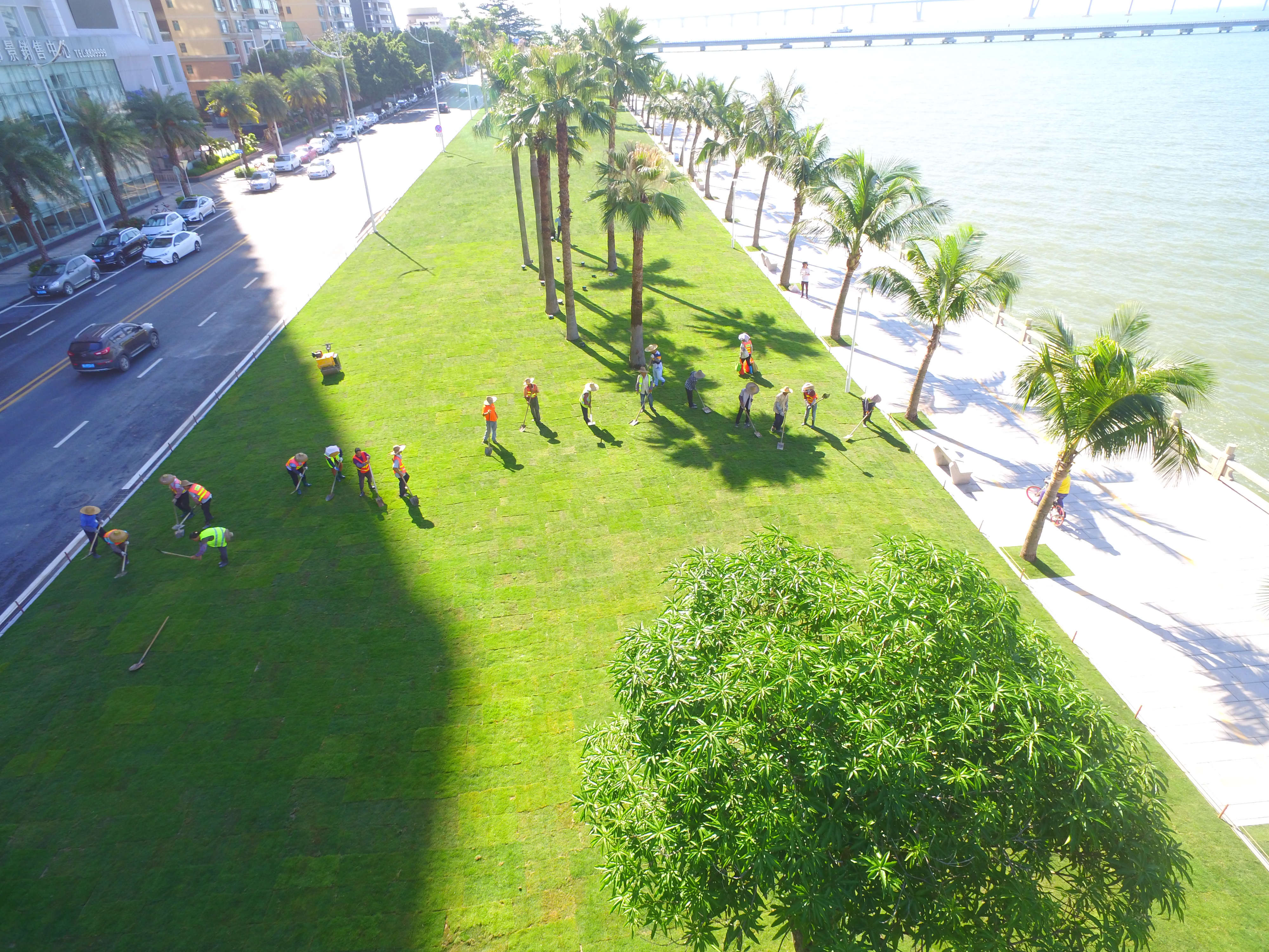 为积极相应珠海市政府办对情侣路(全球通大厦至拱北口岸段)环境景观整治提升的工作要求,珠海市香洲正方控股有限公司(以下简称:正方控股)全力跟进此次提升改造工程,高标准做好了裸土复绿、规范设置指示牌、植物支撑架拆除、绿植花卉管养提升、草坪积水处理及绿化微造型设计等各项工作。目前经过4天4夜96小时的紧张施工,九洲驿站到海湾驿站的800米,共计1.92万㎡的路段已基本改造完毕。