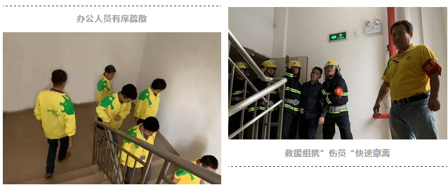 15:15时,听到模拟消防疏散信号后,各楼层参加疏散的人员纷纷拿起消防毛巾捂住口鼻,在工作人员的指引下井然有序地沿大楼疏散通道到达指定位置,同时拨打119火警电话。巡查员现场查看并找到火灾发生点,应急抢险组、救护组按照分工迅速展开救援。