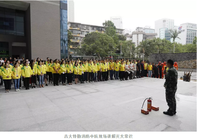 疏散人员在工作人员的引导下排队集结,由消防工作人员现场讲解灭火常识及灭火器的使用方法,随后进行实操演练。