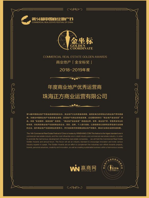 作为珠海唯一一家问鼎“年度商业地产优秀运营商”奖项的企业,正方商业运营倍感荣幸与自豪。在珠海深耕八载,本着“让城市更美好”的企业愿景,正方商业运营公司深度理解商业与人、自然与文化的关系,因地制宜地为珠海打造出一个个“量身定制”的商业项目如“城市客厅”、“城市阳台”等,也因此得到行业认可,被评选为推动行业进步之榜样。