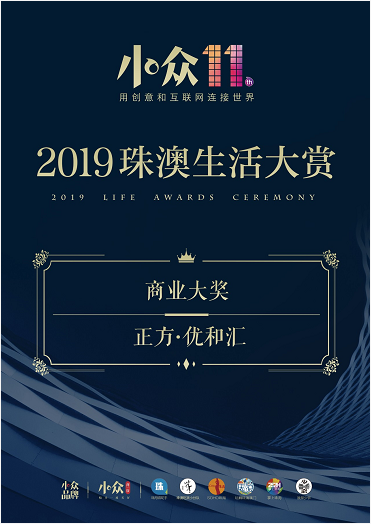 珠海市香洲正方控股有限公司下属公共运营板块珠海正方商业运营有限公司精心打造的“正方·优和汇”在“2019珠澳生活大赏颁奖礼”中,凭借其先进的商业配套、丰富的业态规划,斩获“商业大奖”!