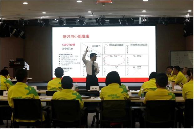 研讨环节,现场气氛十分热烈。参训人员按照业务板块共分为六组,紧紧围绕公司的定位和战略目标,结合公司所处内外部环境,利用SWOT分析工具,对公司的优势、劣势、机会和威胁展开头脑风暴,并依次进行了成果汇报。