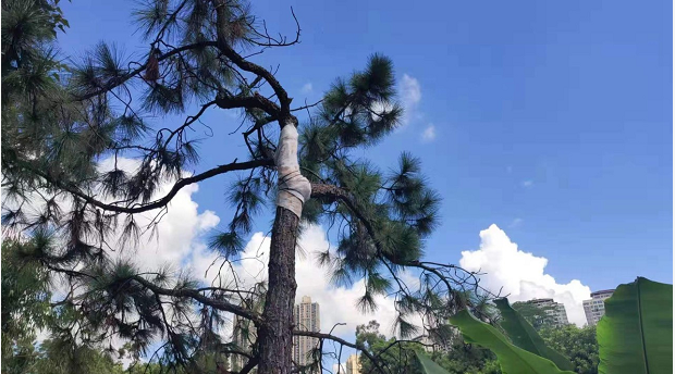 早年居住在此的住户曾有牵拉电线等行为,在树木表面留下了锈迹斑斑的伤痕。针对此类情况,施工方制定了相应的保护修复措施:将树干修平伤口后涂上树枝修复液,用无纺布袋重新包扎,一来避免暴晒,二来保持布袋湿润,有利于伤口自动生长愈合。