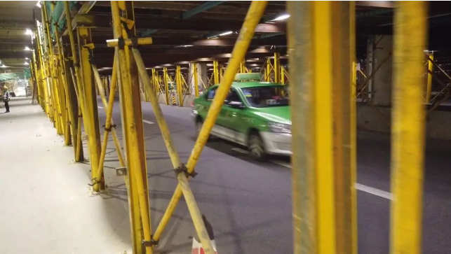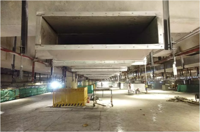 地下通道环境密闭,且原有通风设施已完全瘫痪,汽车尾气、施工废气等气体难以排出,施工环境平均温度比地面高5到6摄氏度。但这些并没有阻碍工程进度,为保障施工人员安全,香洲正方设置了12台排风机,排出通道中的废气。同时,采用已经焊接完成的施工平台部件,减少因组装产生的废气。