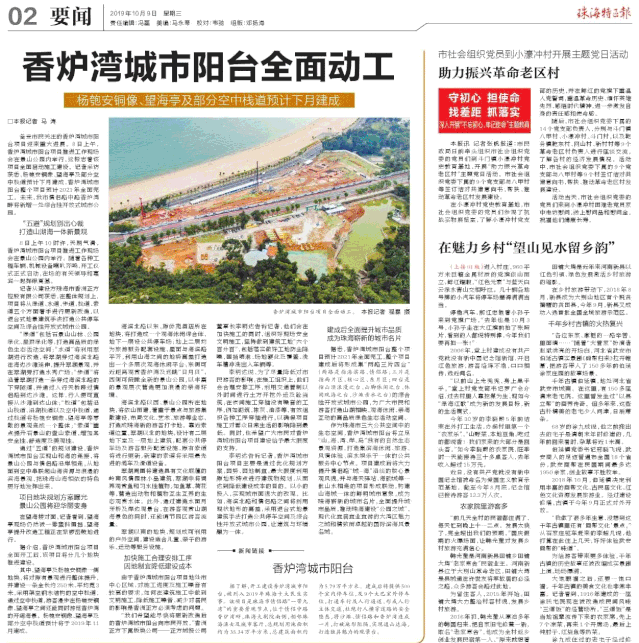 开工建设香炉湾城市阳台,被列入2019年珠海十大民生实事。该项目是珠海市情侣路“一带九湾”的重要景观节点,位于情侣中路香炉湾畔,珠海大剧院南侧,相邻珠海渔女及城市客厅,总规划用地面积约为35.34万平方米,总建筑面积约为5.79万平方米。