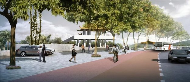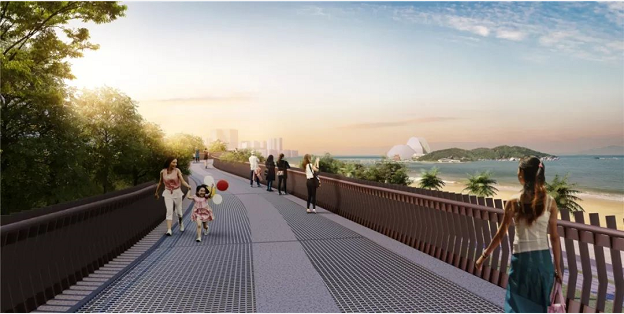 项目将景山公园与情侣路沿岸连接起来,从地面到空中,串联起山海资源与浪漫的滨海景观。与此同时,打通车行及人行通道,形成人行立体交通,可杜绝行人横穿马路。