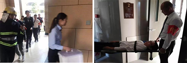 演练开始,警报响起,参与演练的人员迅速沿蔚蓝公馆消防疏散楼梯口快速前进,撤离到开阔区域。到达之后马上清点人数,并报告给总指挥,疏散演练全程井然有序。