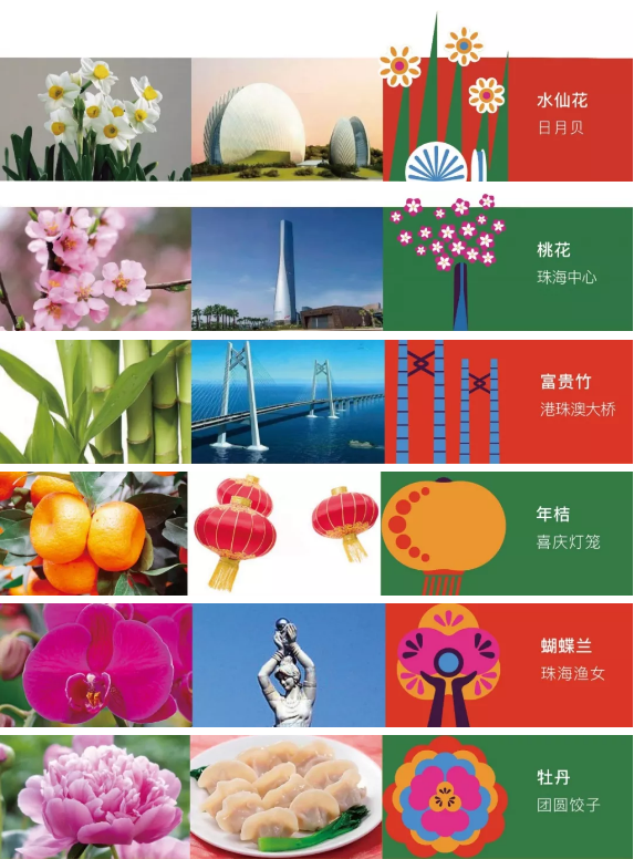 延伸设计以更热情的配色表达珠海城市的年轻与活力。借不同的新年花卉,结合珠海地标,给市民游客呈现出不一样的港珠澳大桥、珠海渔女、日月贝等。以年花的名义,向人们发出珠海独特的新春祝福。