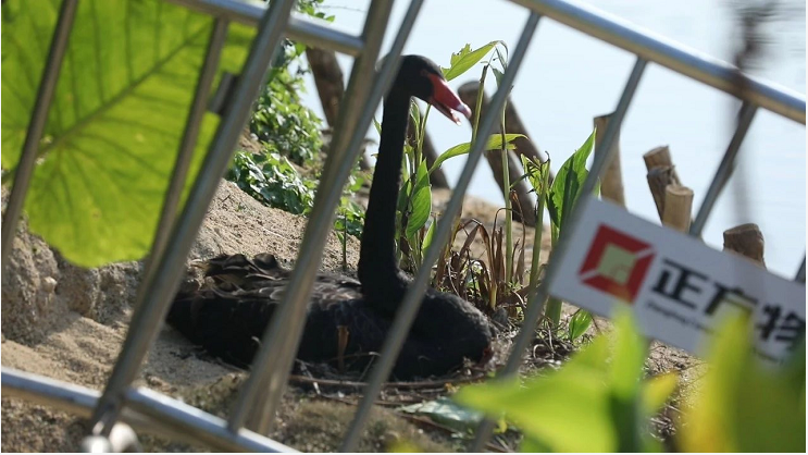 2019年11月底,工作人员在巡查中,发现黑天鹅在草丛中的巢里产下了天鹅蛋。为了能让天鹅宝宝在适宜的温度和生态环境下自然孵化,管理人员为它们暖心设置了铁马围蔽措施以免被打扰。