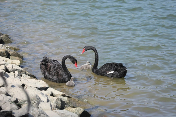 黑天鹅宝宝们会在父母的陪伴下走出巢窝,到湖面畅游嬉戏。天鹅爸爸妈妈对两个小家伙疼爱有加,警惕性极高,时刻察看周边情况,不允许其它天鹅接近。两个小家伙精神抖擞,其中一只“任性”地不时潜入水中,它调皮的举动似乎令天鹅妈妈很担忧,不断发出“克噜,克噜,克噜”的叫声,似乎在提醒宝宝。