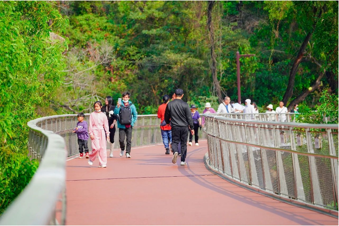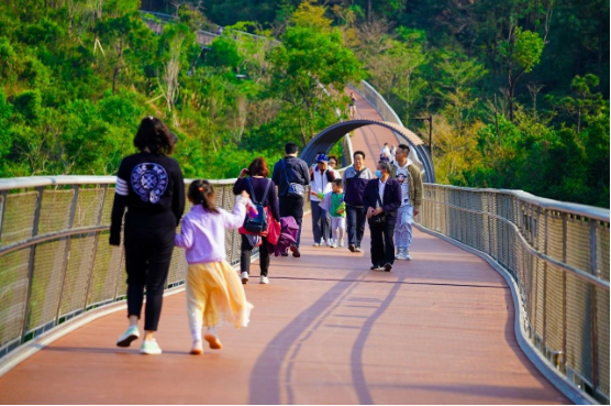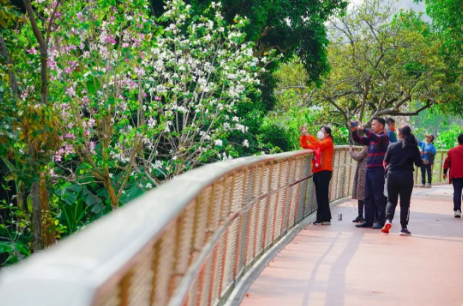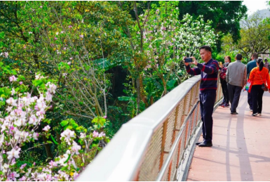 漫步宽阔平坦的步道上,草木繁盛、花香四溢,粉嫩的宫粉紫荆花开正艳,市民游客纷纷拿起手机,记录下属于春天的美好。