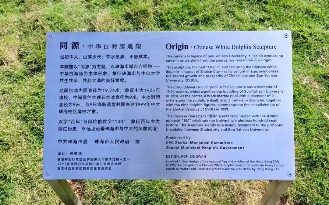“同源·中华白海豚”雕塑广场位于中山大学珠海校区内,占地面积550㎡。作品以珠海城市吉祥物“中华白海豚”为主体形象,以“同源”为主题,以“圆”为设计灵感,象征珠海与中山大学相得益彰、同心共圆,携手培育新时代国家人才、共赴时代大潮的美好愿景。