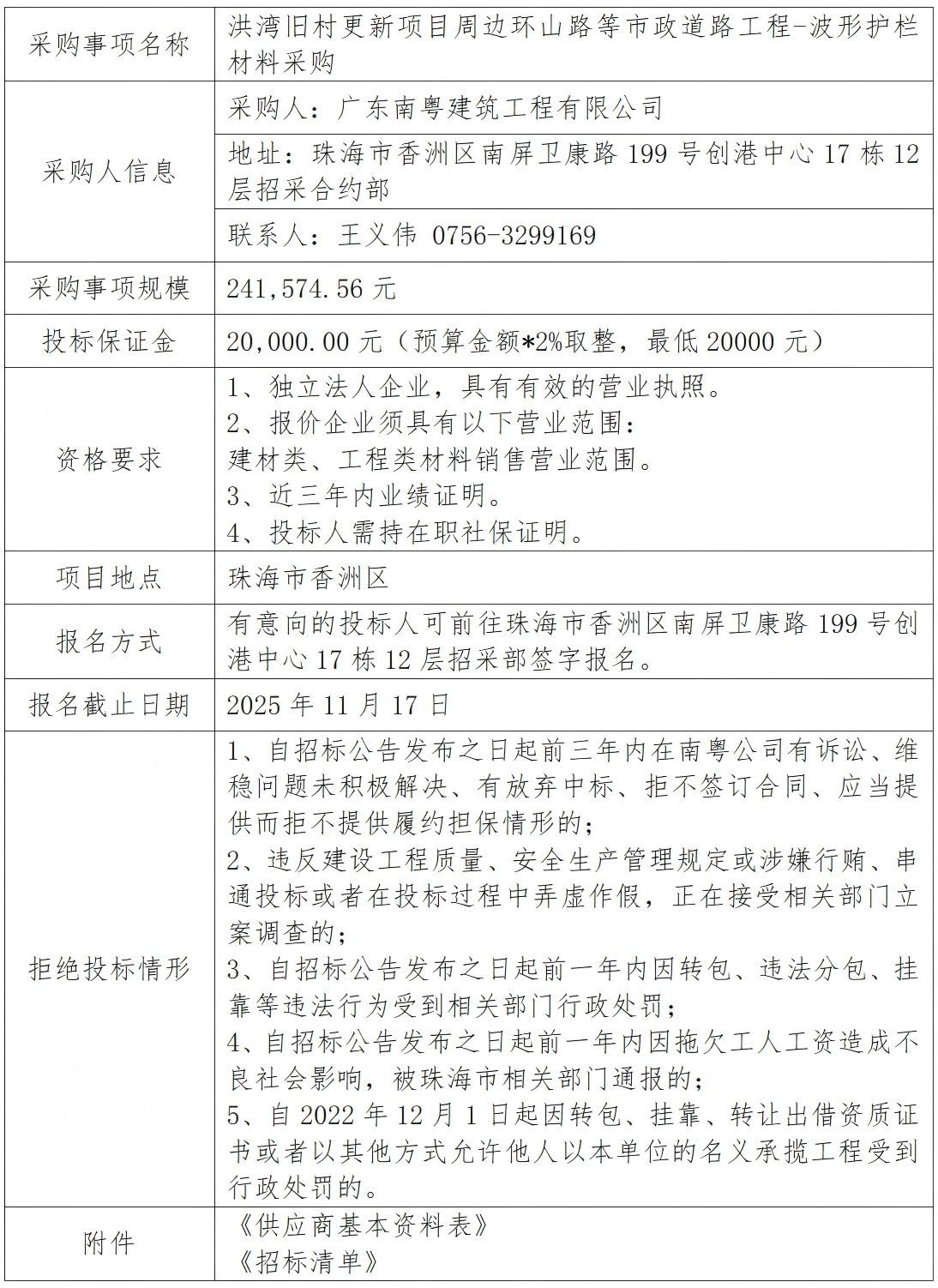 洪湾旧村更新项目周边环山路等市政道路工程-波形护栏材料采购 专栏:工程招标 发布日期: 2025-11-12 作者:招采管理中心 附件:供应商基本资料表 附件:洪湾旧村更新项目周边环山路等市政道路工程-波形护栏材料采购招标清单 返回列表 上一篇:广昌保障房配套基础设施项目施工总承包--软基处理工程专业分包(施工技术要求调整) 下一篇:广昌保障房配套基础设施项目施工总承包-云端监控设备及技术服务