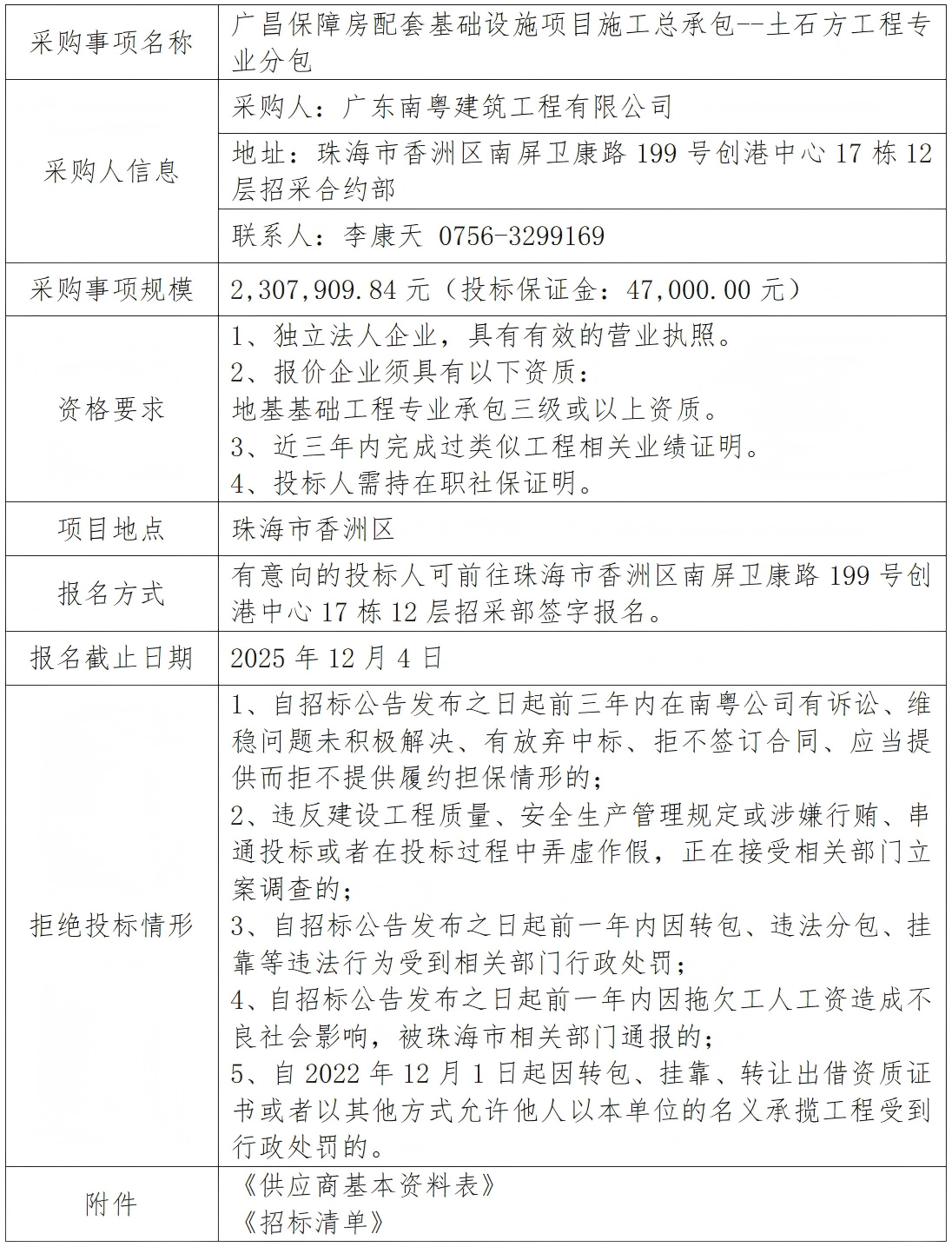 广昌保障房配套基础设施项目施工总承包--土石方工程专业分包 专栏:工程招标 发布日期: 2025-12-01 作者:招采管理中心 附件:供应商基本资料表 附件:广昌保障房配套基础设施项目施工总承包--土石方工程专业分包- 空白清单 返回列表 上一篇:广昌保障房配套基础设施项目施工总承包-食堂服务 下一篇:广昌保障房配套基础设施项目施工总承包-地材材料采购招标